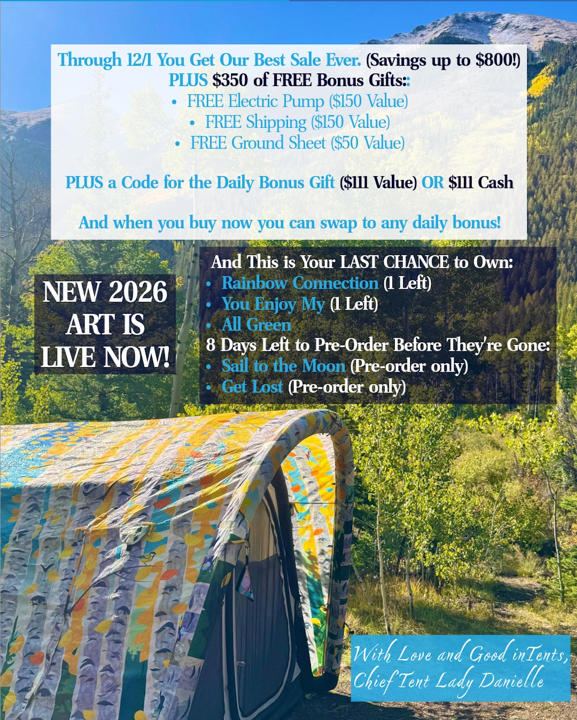 Good inTents is re-imagining the future of camping to exceptionally beautiful, comfortable, and sustainabuilt for life. We are a female founded company from ColoRADo that invented an innovative new inflatable tent camping solution (multiple patents pending!) that is a luxurious artisan camping tent that will change the way you experience nature. We launched ΩTent (Omega Tent) in May 2024 after 2 years of inTENTse product development and testing to create a high quality product that is sustainabuilt for life. She's not just BE YOU-tiful, she's smart and strong too! ΩTent will inspire you to create a lifetime of your favorite memories and stories.